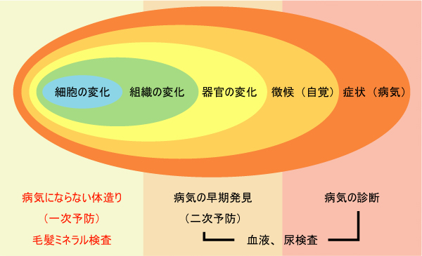 毛髪ミネラル検査は、病気になる前の細胞レベルの変化を見ることができる予防医学検査です。臨床検査(血液検査・尿検査など)は病気の診断などに必要な検査ですが、体内恒常性(ホメオスタシス)の影響を受けているため、長期的な体内情報を得るには適していません。毛髪は、安定的に成長した細胞の集まりであり病気や健康状態の因子を記録するため、食生活の改善や不定愁訴の原因究明に役立ちます。